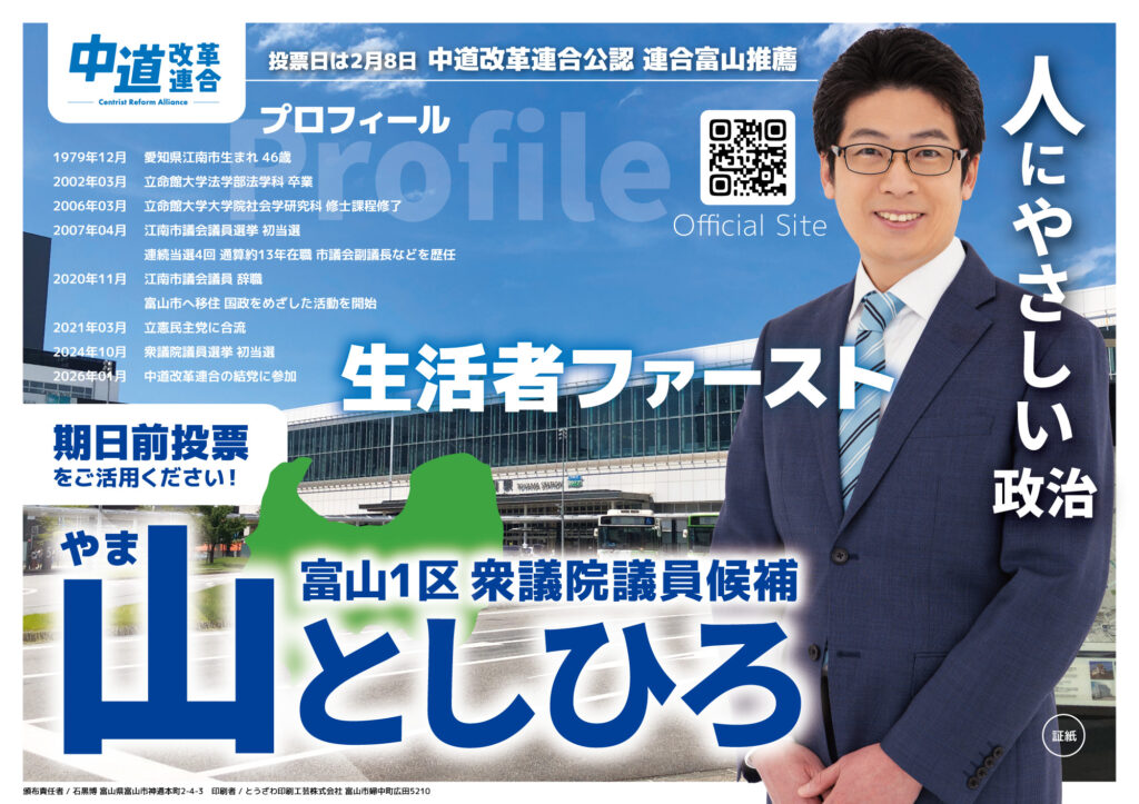 SNSでシェア 2026.1.28 山としひろの政策をまとめました 人間を大事にする「人にやさしい政治」 その決意を、こちらの政策に凝縮しました。 止まらない物価高、格差・貧困の拡大、人口減少と地域の衰退、医療・介護・年金制度の綻び、相次ぐ自然災害、世界の戦争・紛争と国際秩序の不安定化…未来を見据えて、人間を大事にする政治を、富山から山としひろと一緒につくりましょう。